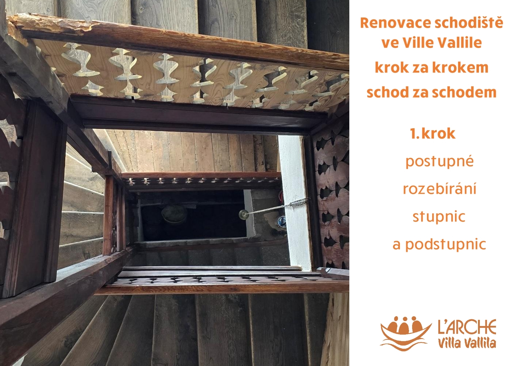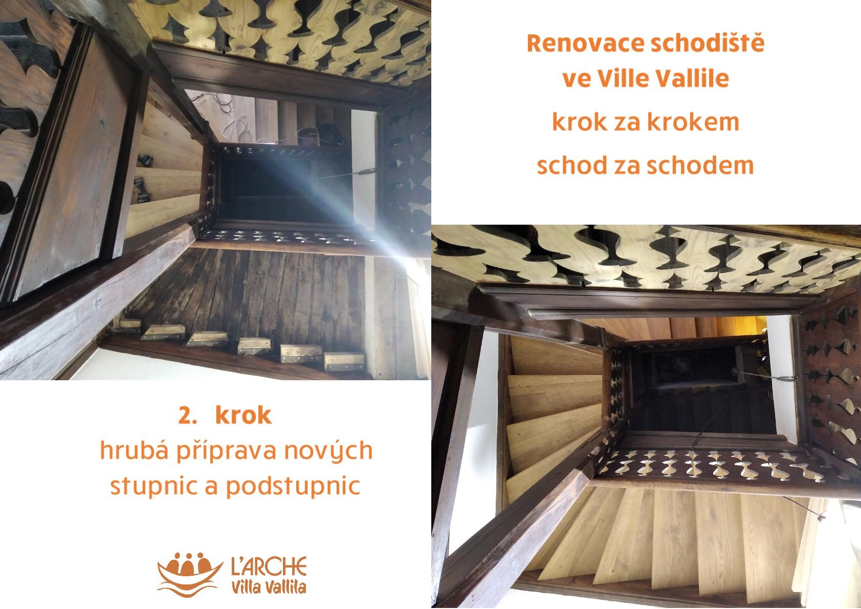 , tak Vám zasíláme další zpravodaj k průběhu renovace schodiště ve Ville krapet se zpožděním. Podívejte se s námi na 2. krok - a to hrubou přípravu a montáž nových stupnic a podstupnic.