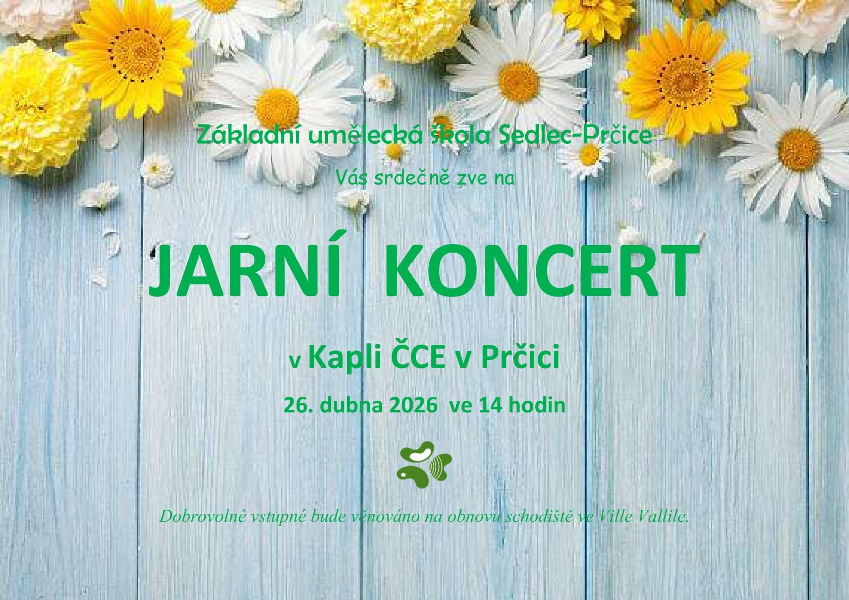 Zároveň Vás zveme na Jarní koncert pořádaný Základní uměleckou školou Sedlec-Prčice, který proběhne dne 26.4.2026 od 14 hodin v Kapli ČCE v Prčici a jehož výtěžek bude použit na výrobu dalších schodů.