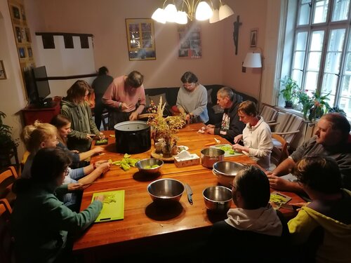 V říjnu jsme se v rámci komunitního dne jali nakládat zeleninu. Roztopili jsme v krbu, sedli si okolo stolu a loupali jsme, oškrabávali, krájeli a do třiceti-litrového kvašáku nakládali rozmanitou směs zeleniny od paprik, přes řepu až po česnek. Dle svých schopností se zapojili všichni členové komunity. Celé nám to kvasilo v kuchyni necelý týden. Až se zima zeptá, budeme mít odpověď!